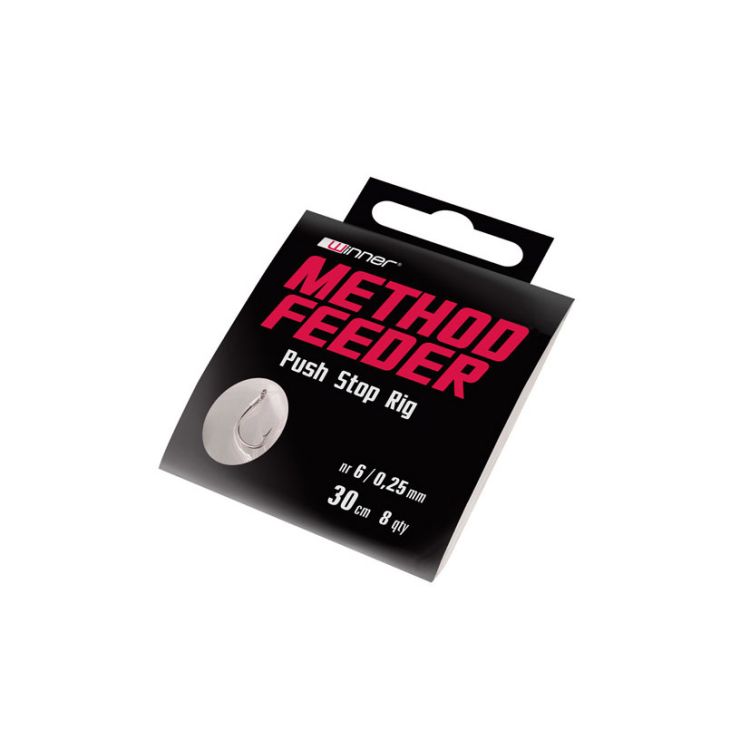 Method Feeder Push Stop Rig to gotowy przypon wędkarski z włosem oraz push stopem przeznaczony do połowu ryb na method feeder. Zawiązany na wysokiej jakości żyłce oraz chemicznie ostrzonym haczyku z oczkiem. Przeznaczony do różnego rodzaju przynęt (minikulki, pellet, robaki, kukurydza) montowanych na włosie. Push stop zapobiega zsuwaniu się przynęty z włosa oraz ułatwia jej ekspresową wymianę. Kształt haczyka oraz mikrozadzior dobrany został w taki sposób, aby jak najbardziej ułatwić hol ryby i uniemożliwić jej wypięcie się.