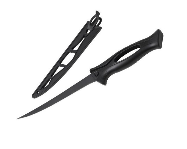 Nóż wędkarski ONTARIO FILET firmy Ron Thompson wykonany został z niezwykle wytrzymałej nierdzewnej, hartowanej stali japońskiej, a następnie pokryto go czarnym kolorem.