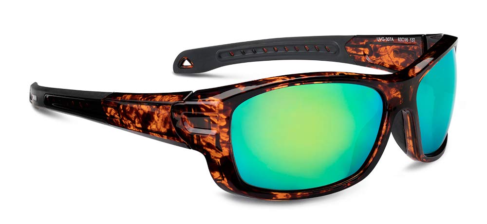 Okulary przeciwsłoneczne zapewniają 100% ochrony przed promieniowaniem UV z polaryzacją do 99% w odpowiednich warunkach oświetleniowych. Przedłużone pokrycie boczne, antypoślizgowe gumowe noski i wygodne gumowe końcówki zwiększają bezpieczeństwo i komfort noszenia. Kolor soczewki: zielony. Kolor ramki: Błyszczący żółty