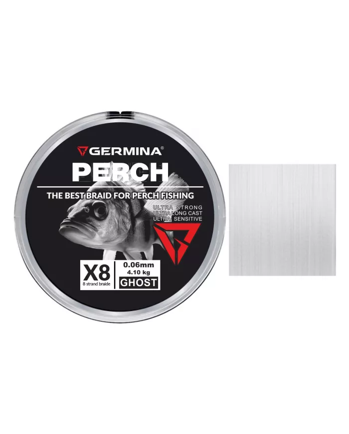 Germina PERCH X8 SPINN GHOST to plecionka dedykowana do połowów okoni. Mocna 8-splotowa, ciasno zapleciona z najwyższej jakości włókien. PERCH SPINN ma wysoką odporność na ścieranie oraz posiada wzmocnioną wytrzymałość na węźle. Dzięki okrągłemu przekrojowi plecionka jest cicha na przelotkach oraz znakomicie układa się na szpuli kołowrotka. Idealnie nadaję się do dalekich i precyzyjnych rzutów.