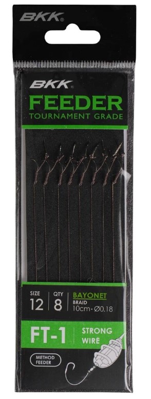 Przypony Feeder Tournament, FT-1 Bayonet Rigs to seria przyponów opracowanych w celu zapewnienia natychmiastowej penetracji i maksymalnej siły podczas łowienia dużych ryb na koszyczek. Wyposażone w charakterystyczne dla BKK wykończenie SS, te haczyki z zadziorami są dokładnie wstępnie przywiązane do wysokiej jakości linek i wyposażone w różne przynęty do mocowania wszelkiego rodzaju przynęt, takich jak kukurydza, granulki, chleb lub mięso.